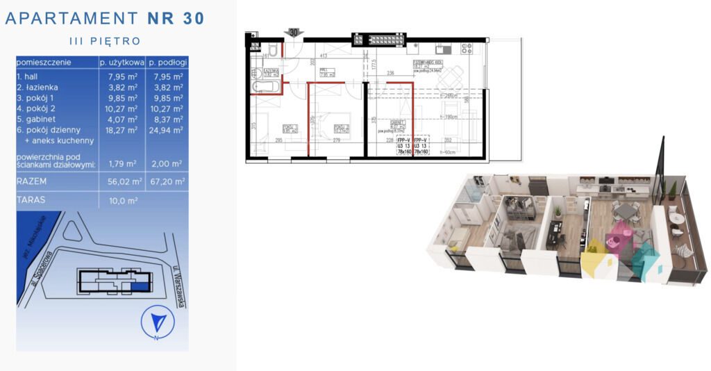 Lokal nr 30 o powierzchni 67,39 m2 położony jest na 3 piętrze i