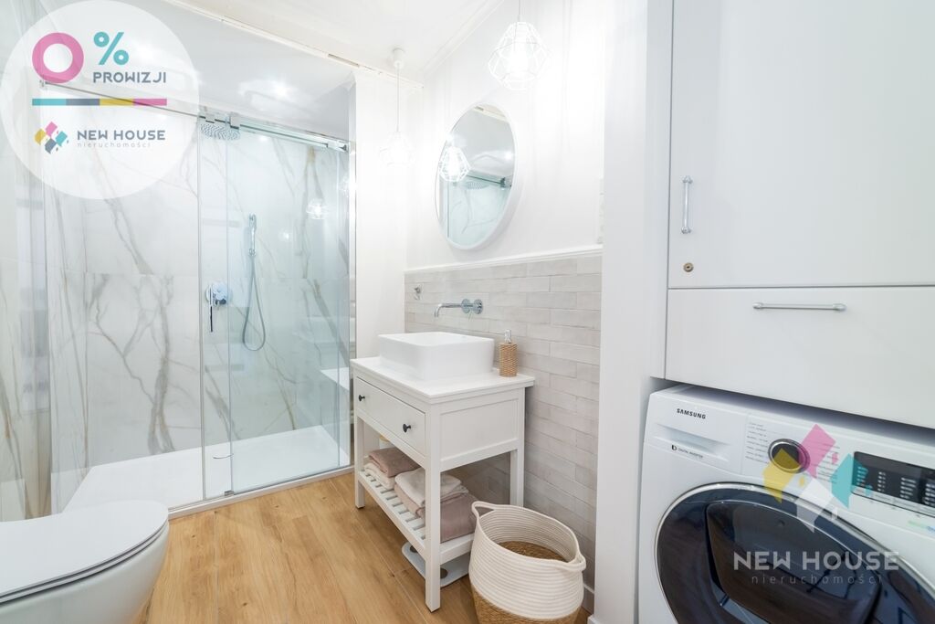 - łazienka z dużym prysznicem, z wc, na wyposażeniu pralka z