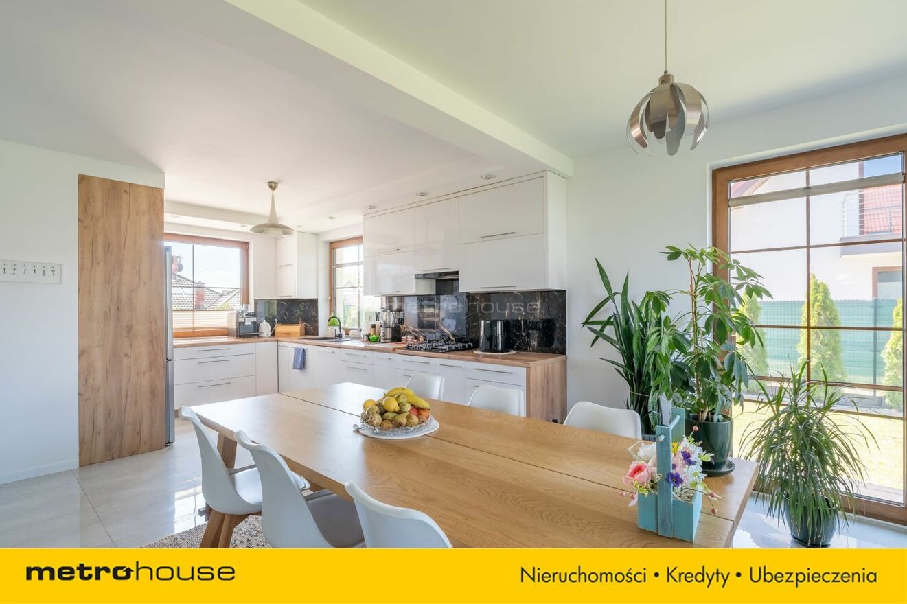 Jasna kuchnia z jadalnią, tworząca przytulną przestrzeń do wspólnych posiłków.