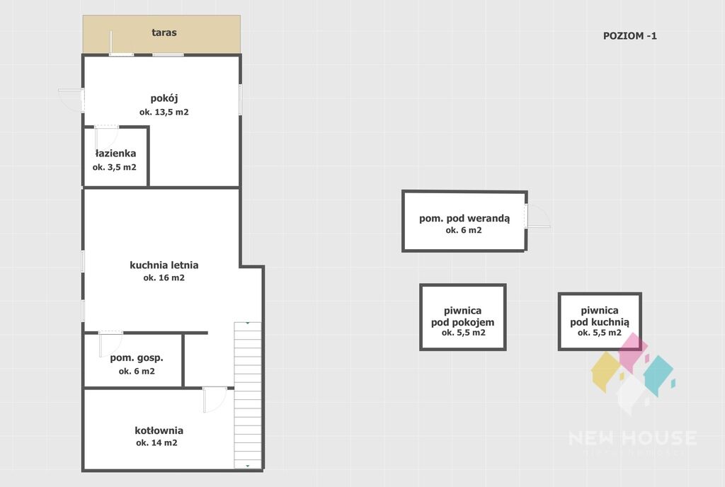 - pomieszczenie pod werandą 6 m2, piwnica pod pokojem 5,5 m2, piwnica